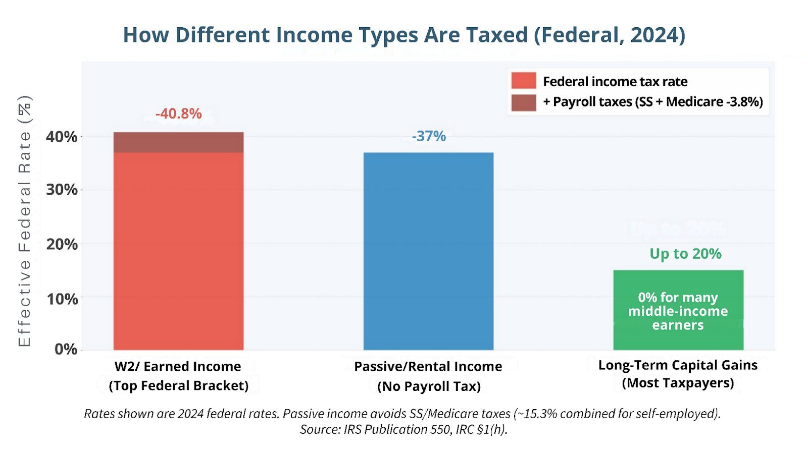 W2 income is taxed heavily, while rental and investment income bypasses payroll taxes and enjoys lower capital gains rates, aiding wealth growth through strategies like 1031 exchanges.