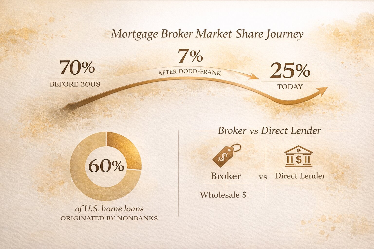 Before 2008, mortgage brokers originated about 70% of loans in the U.S. After the financial crisis and the passage of Dodd-Frank, that number dropped to roughly 7%. The industry rebuilt, and brokers now hold about 25% of the market again. But the old reputation lingered.