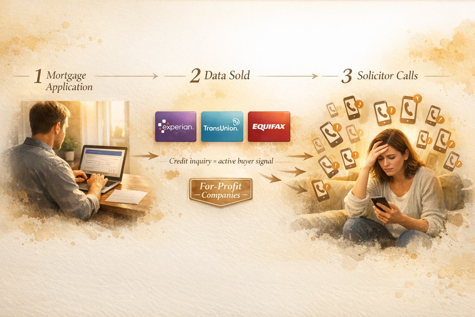 The mechanics of this problem are simpler than most people realize - and that’s part of what makes the whole thing so frustrating. As Brendan explained in the episode, the moment a mortgage company pulls your credit, the three major credit bureaus - Experian, TransUnion, and Equifax - sell your information to competing solicitors. A credit pull signals you are actively in the market for a mortgage. That data is valuable, and until recently, it was completely legal to sell it without your consent.