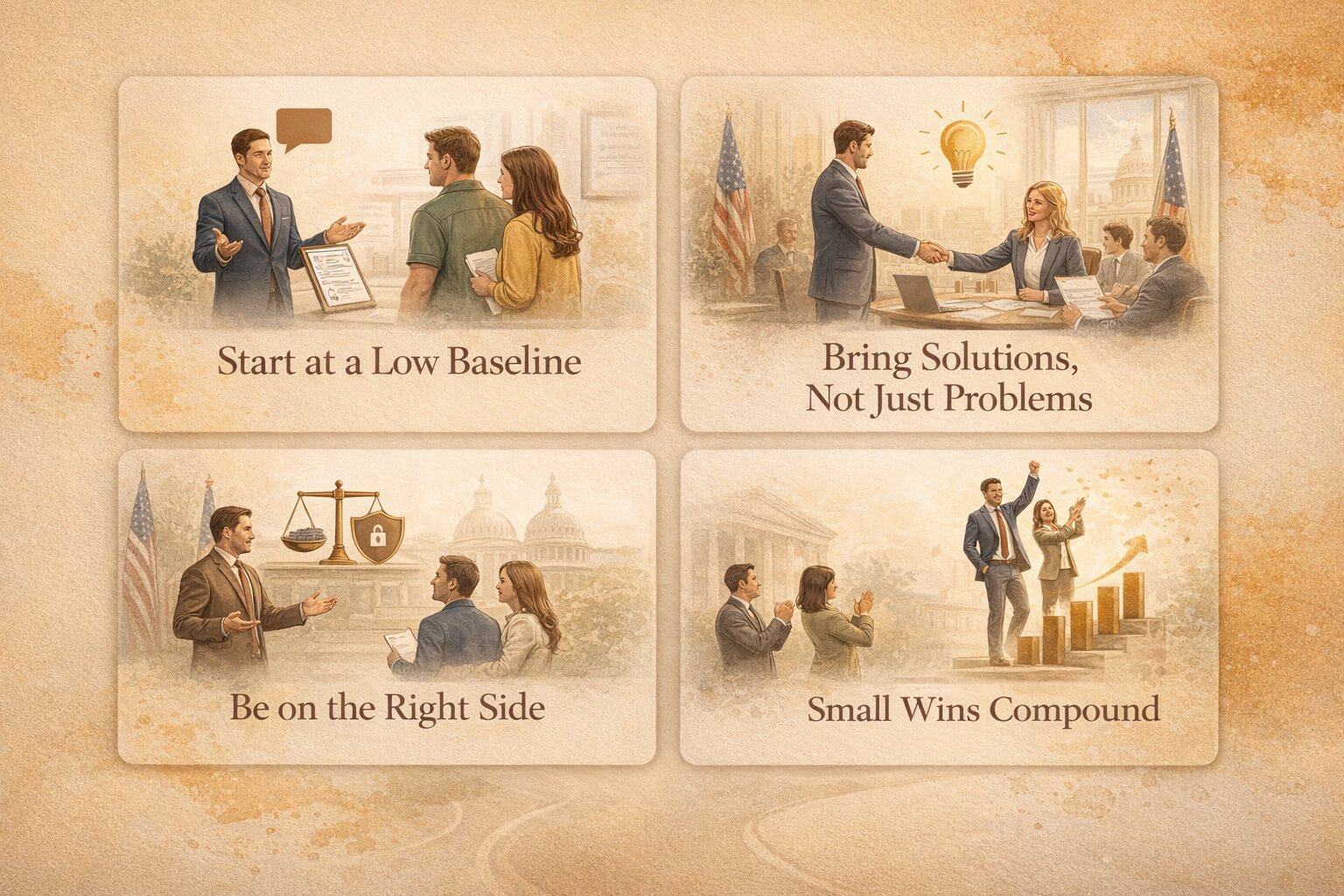 Bring solutions, not just problems. Congressional offices are full of people bringing problems. The professionals who get traction bring answers alongside them.