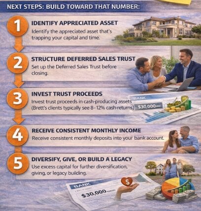 A Deferred Sales Trust is an installment sale structure. You exit your asset, defer capital gains taxes, and receive income over time - without needing a 1031 exchange or any like-kind replacement. Here's the step-by-step process Brett walked me through: