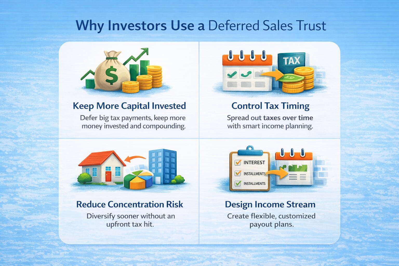 A Deferred Sales Trust is an installment sale structure where a seller transfers a highly appreciated asset to a trust, receives a promissory note, and pays capital gains taxes only as installment payments are received over time.