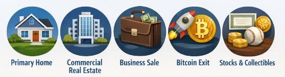 Anyone with $1M+ in net proceeds and $1M+ in capital gain from a business, real estate, Bitcoin, primary home, stock, or collectibles. The strategy works across asset classes.