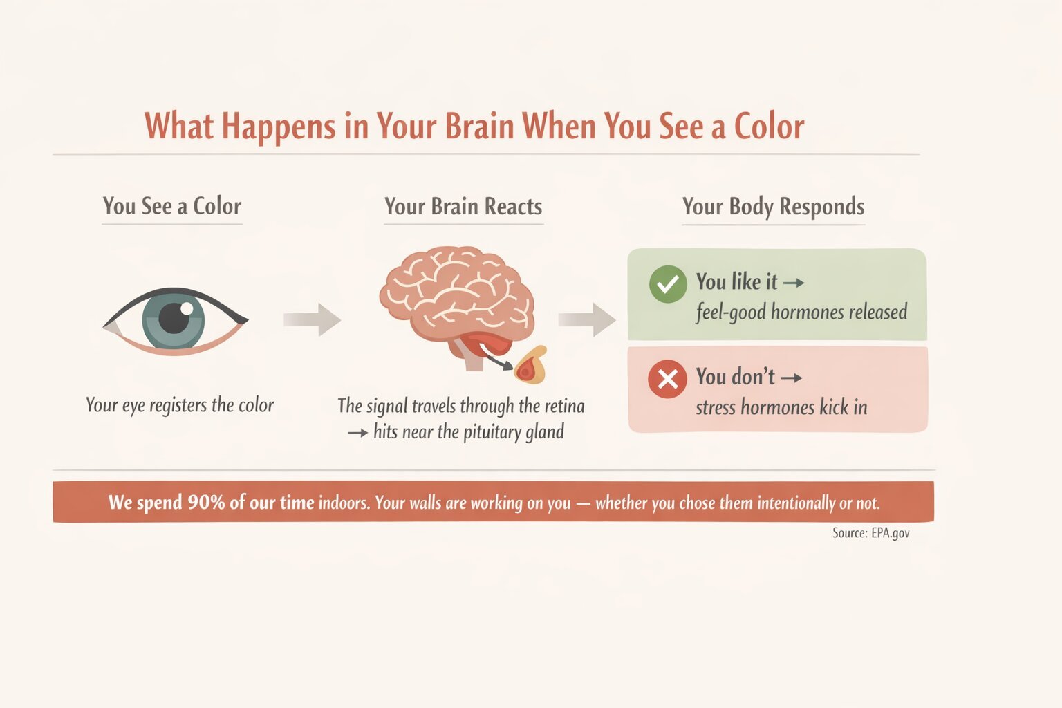 Color is where this becomes very concrete. According to EPA.gov, we spend about 90% of our time indoors. When your eye registers a color, the signal travels through the retina and lands near the pituitary gland - triggering feel-good hormones if you like it, or stress hormones if you don't. And yet most homeowners choose paint colors because they match the bedspread.