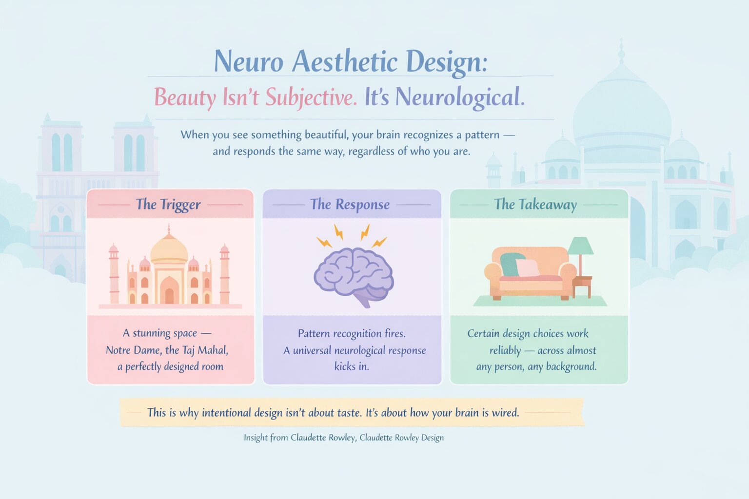 Neuro aesthetic design is the science of how beauty affects the brain. Think about standing in front of Notre Dame or the Taj Mahal.