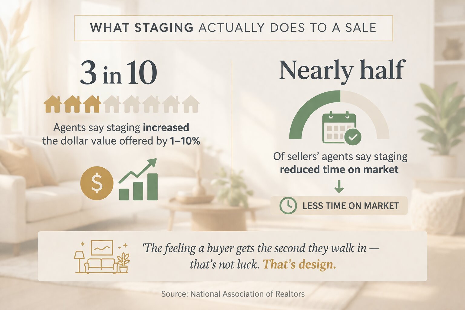 They want to walk in, exhale, and feel like they’ve already come home. According to the National Association of Realtors, nearly three out of ten agents report that staging their sellers’ homes led to a 1–10% increase in the dollar value offered - and almost half observed that staging reduced time on market.