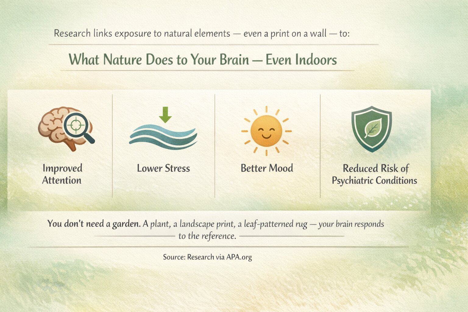 Research links exposure to natural elements - even a nature-inspired print on a wall - to improved attention, lower stress, better mood, and reduced risk of psychiatric conditions.