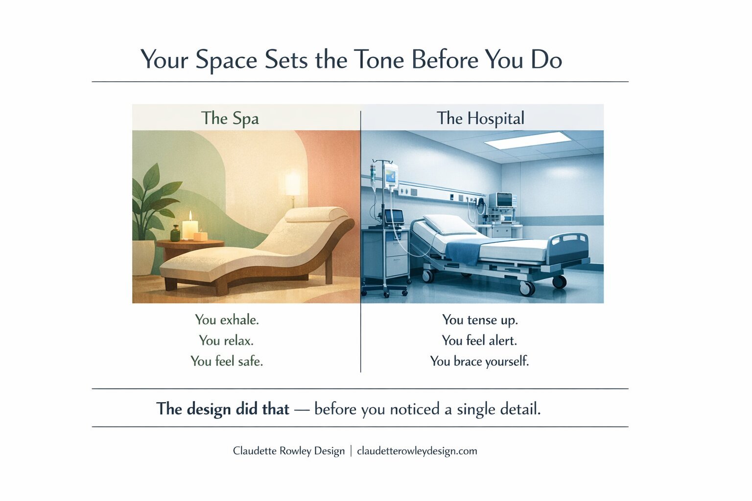 Claudette used an example that landed immediately: think about how you feel at a spa versus a hospital. Now ask yourself - if your spa looked more like a hospital, would you still relax? If your hospital room looked more like a spa, might you be slightly less anxious? The design is doing the work before you've registered a single detail.