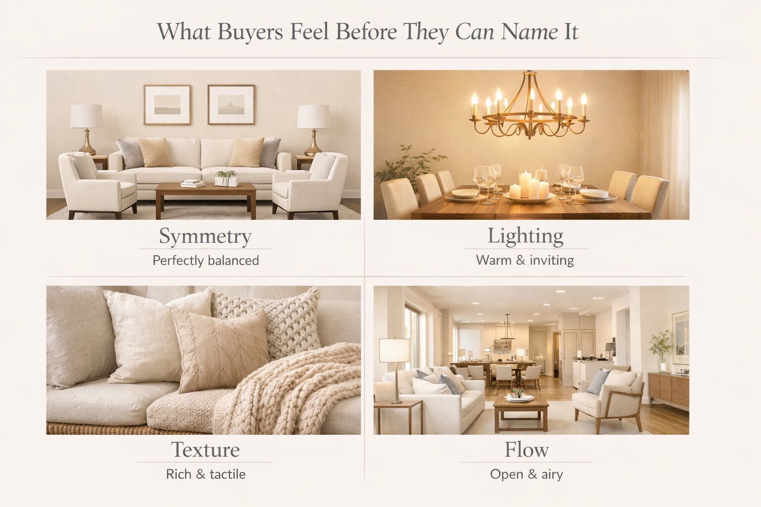 Balanced furniture and distributed visual weight make buyers exhale. A lopsided or chaotic room creates tension they can’t always name.