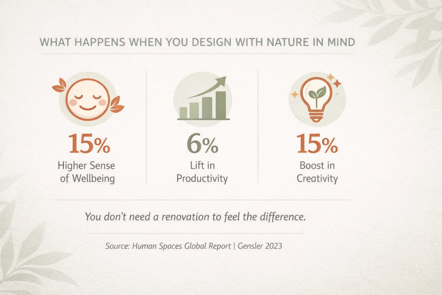 Claudette was clear about how interior design reduces stress: small, intentional changes make a measurable difference. You don’t need a renovation. Employees in spaces rich with natural elements report a 15% higher sense of wellbeing and a 6% lift in productivity, with creativity climbing up to 15% - and similar principles apply at home.