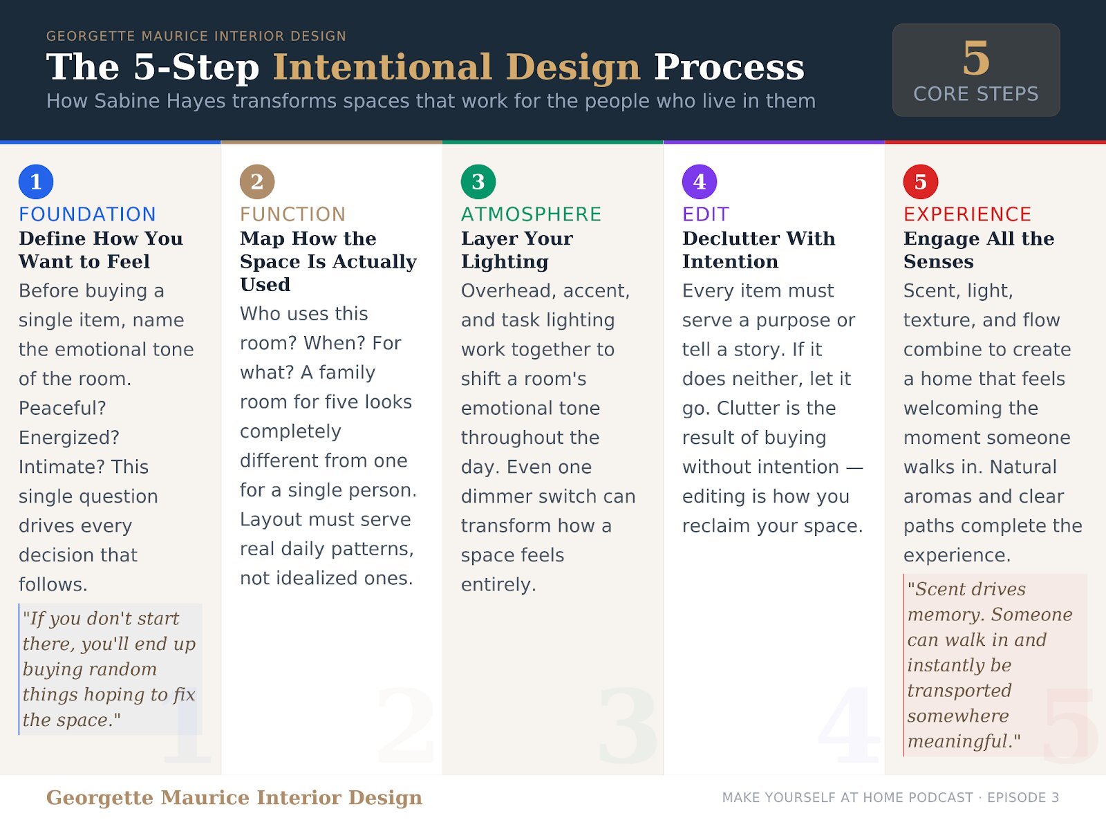 This one shift prevents more interior design mistakes than almost anything else. When you know the emotional tone you are chasing, you stop impulse‑buying and start building a room that supports how you actually live. If you need guidance in structuring your design journey, this podcast framework helps gather your thoughts before working with a professional.