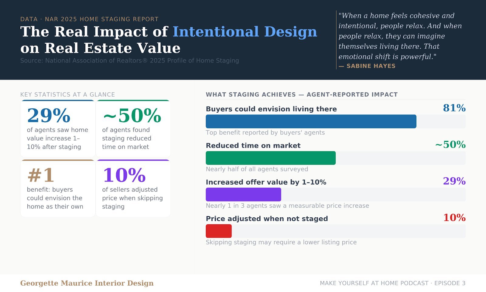 Cohesive, intentional design helps buyers relax and imagine themselves living in a space, which increases perceived value. Staging can increase offers and help homes sell faster.