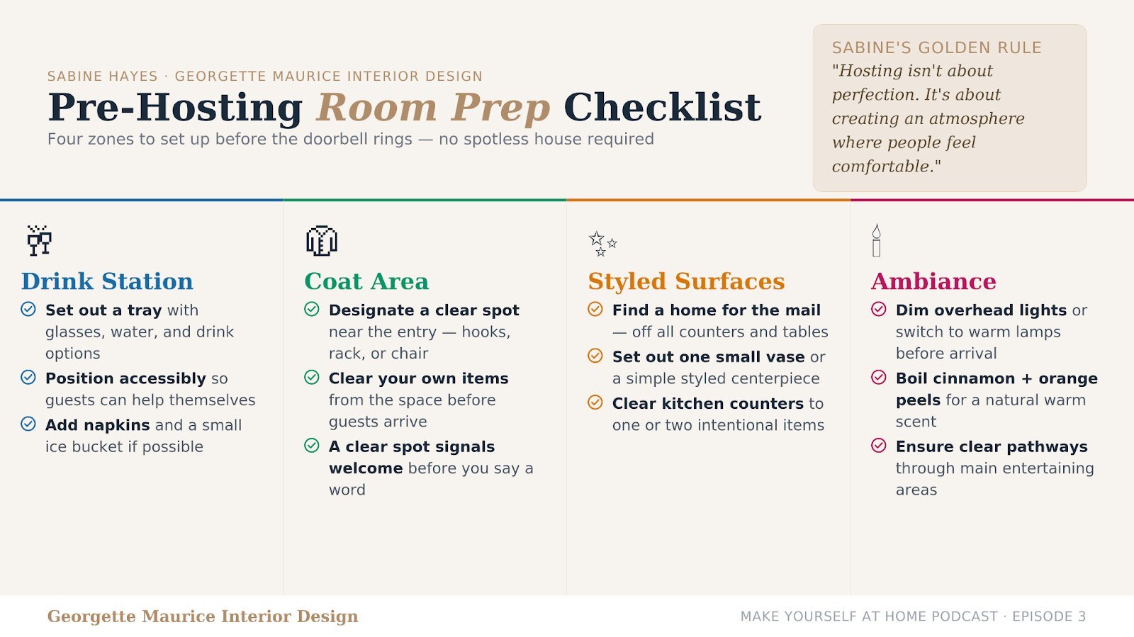 Set up a drink station, designate a coat area, style surfaces in advance, and remember that mindset matters more than perfection.