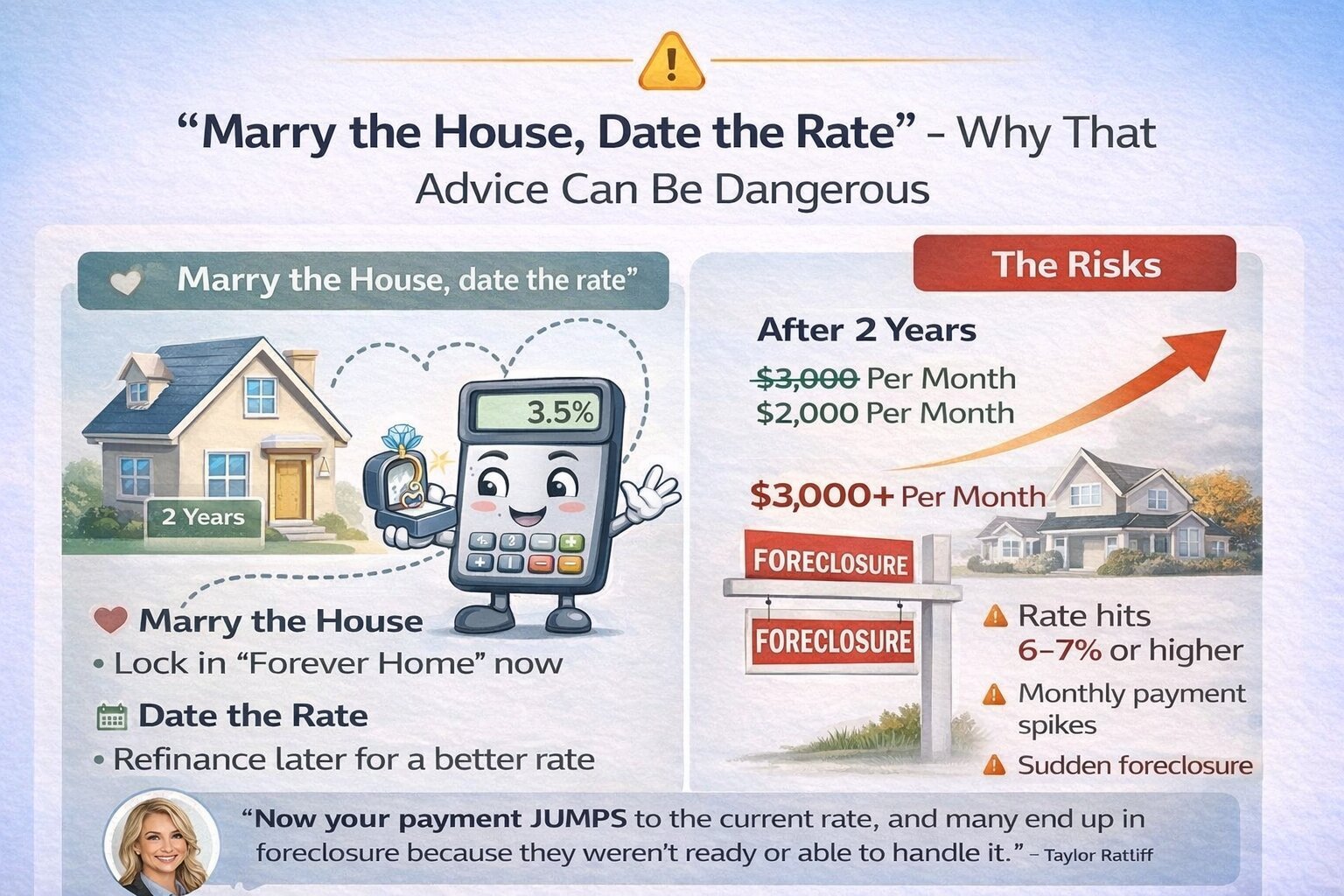 Taylor calls it the worst advice in real estate. The marry the house date the rate meaning - lock in the home and refinance later - assumes rates will drop in a way that has already pushed real Colorado buyers into foreclosure.