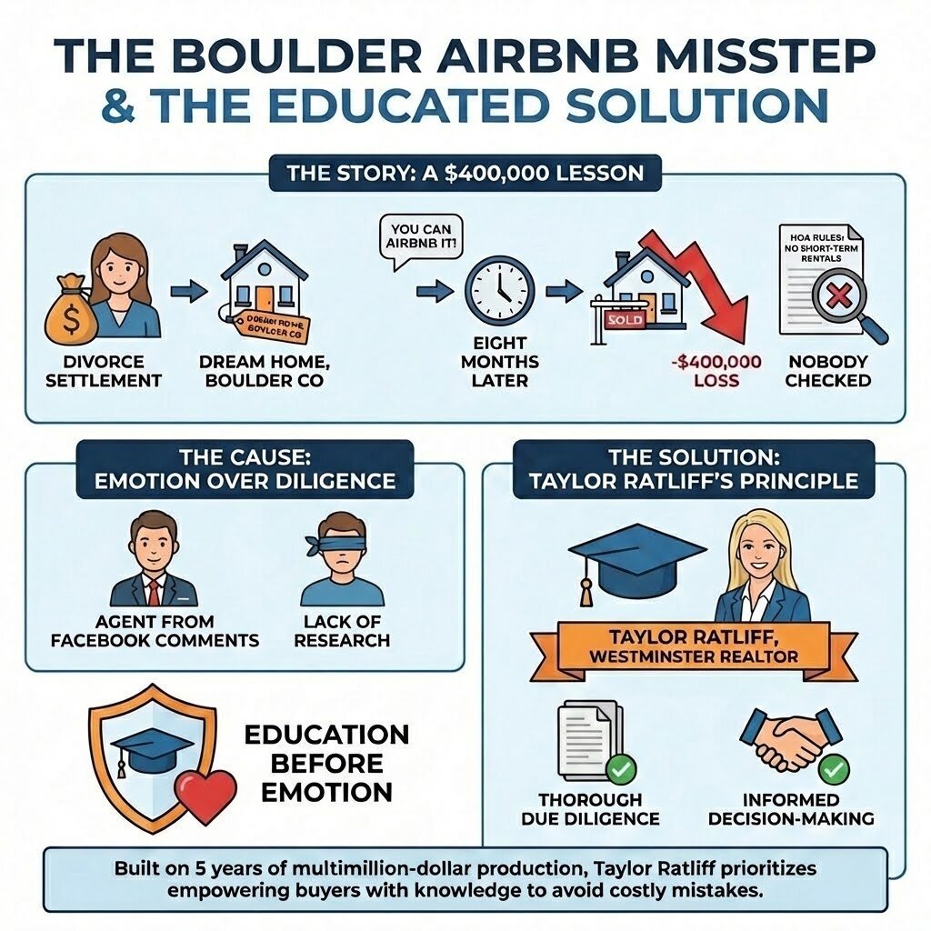 A woman buys her dream home in Boulder with her divorce settlement. Her agent tells her she can Airbnb it. Eight months later, she sells at a $400,000 loss because nobody checked the HOA rules. That story alone should terrify every buyer who picks an agent off a Facebook comment thread - and it’s exactly why Taylor Ratliff, a Westminster Colorado real estate agent with five years of multimillion-dollar production, has built her entire practice around one principle: education before emotion.